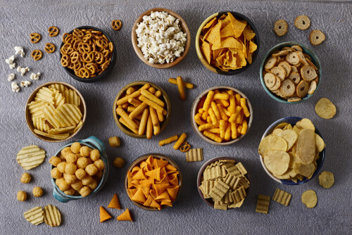وجبات خفيفة متنوعة في أوعية فخارية على خلفية رمادية