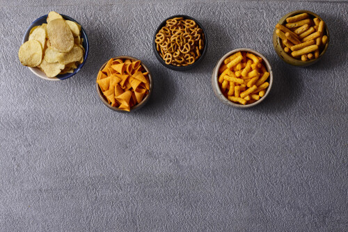 وجبات خفيفة متنوعة في أوعية فخارية على خلفية رمادية