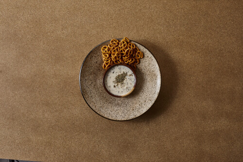 وجبات خفيفة متنوعة على طبق فخاري مع غموس على خلفية بنية