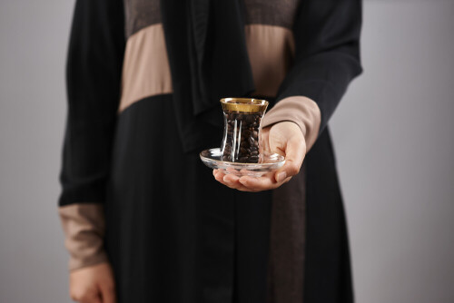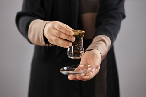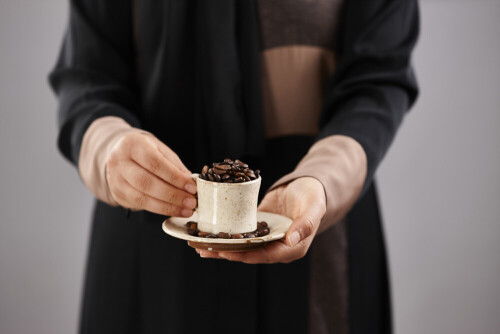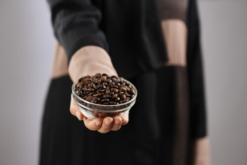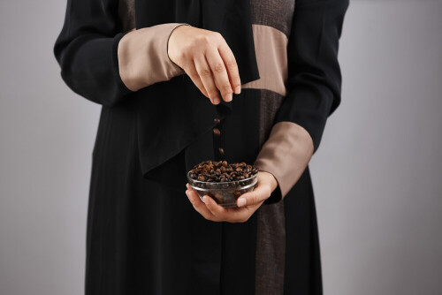 امرأة ترتدي عباءة تحمل أنواع مختلفة من حبوب القهوة في أوضاع متعددة