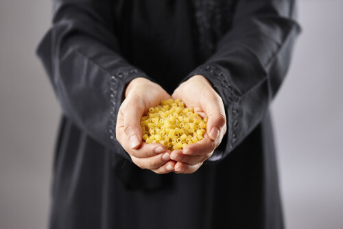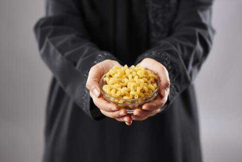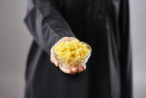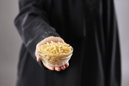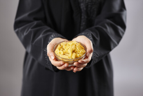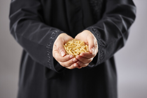امرأة ترتدي عباءة تحمل أنواع مختلفة من المعكرونة في أوضاع متعددة
