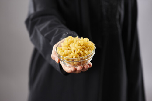 امرأة ترتدي عباءة تحمل أنواع مختلفة من المعكرونة في أوضاع متعددة