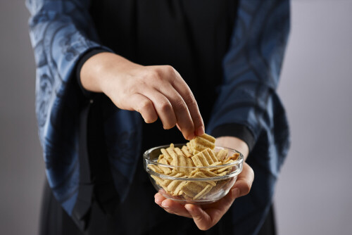 امرأة ترتدي عباءة تحمل أنواع مختلفة من الوجبات الخفيفة في أوضاع متعددة