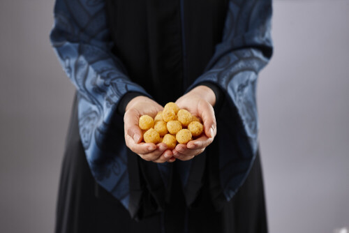 امرأة ترتدي عباءة تحمل أنواع مختلفة من الوجبات الخفيفة في أوضاع متعددة