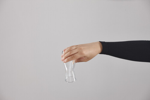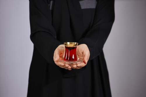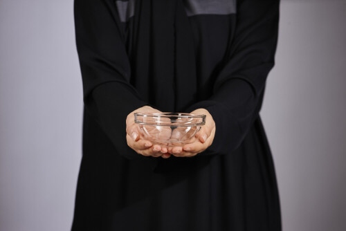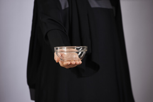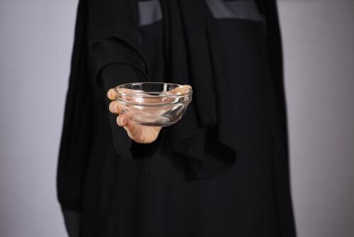 امرأة ترتدي عباءة سوداء تحمل أدوات زجاجية مختلفة في أوضاع متعددة