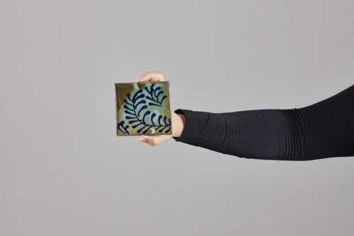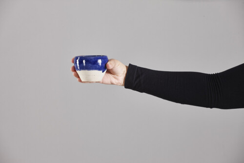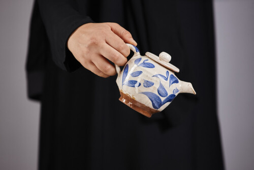 امرأة ترتدي عباءة سوداء تحمل أدوات فخارية مختلفة في أوضاع متعددة
