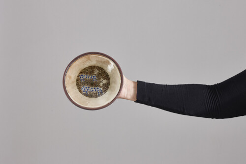 امرأة ترتدي عباءة سوداء تحمل أدوات فخارية مختلفة في أوضاع متعددة