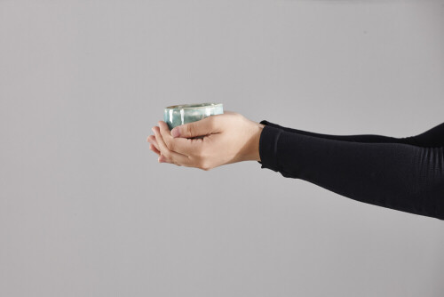 امرأة ترتدي عباءة سوداء تحمل أدوات فخارية مختلفة في أوضاع متعددة