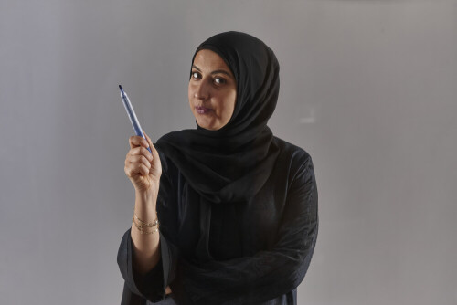 امرأة ترتدي عباءة سوداء وحجاب وتمسك بقلم للكتابة على لوح شفاف مع ردود فعل وتعبيرات مختلفة على خلفية رمادية
