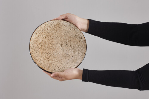 A woman in black abaya holding different pottery essentials in different positions