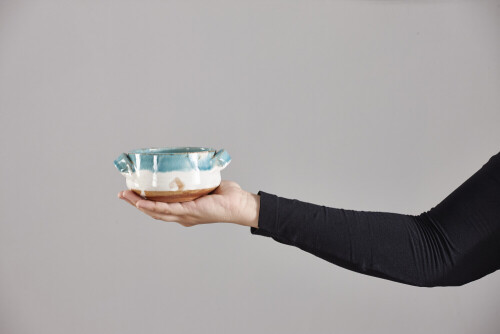 A woman in black abaya holding different pottery essentials in different positions