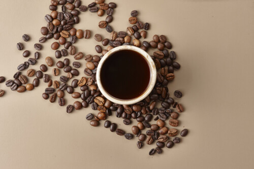 A beige pottery cup of coffee surrounded by roasted coffee beans on beige background