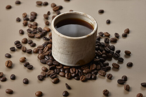 A beige pottery cup of coffee surrounded by roasted coffee beans on beige background