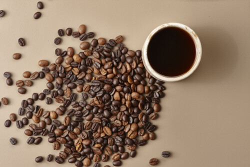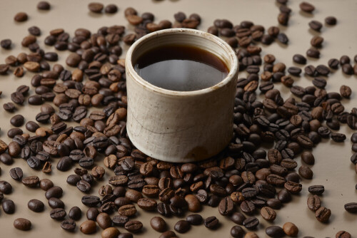 A beige pottery cup of coffee surrounded by roasted coffee beans on beige background