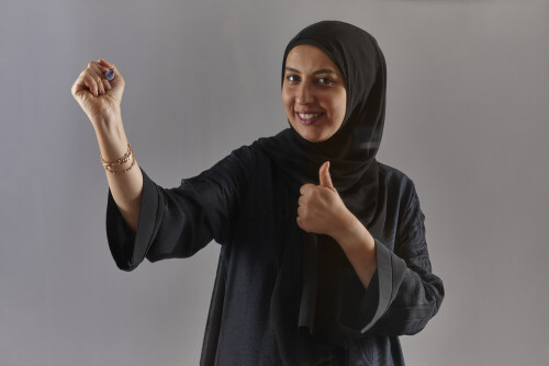 Woman in black abaya and hijab holding a marker pen to write on a transparent board with different reactions and expressions on grey background
