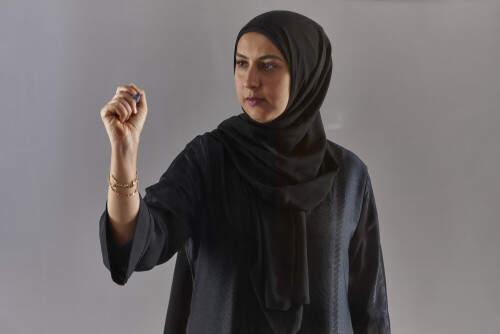 Woman in black abaya and hijab holding a marker pen to write on a transparent board with different reactions and expressions on grey background