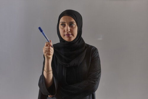 Woman in black abaya and hijab holding a marker pen to write on a transparent board with different reactions and expressions on grey background