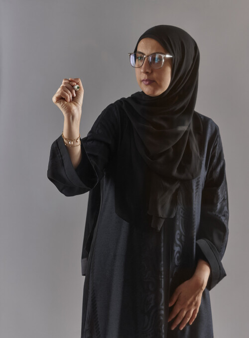 Woman In Abaya Writing On Transparent Board