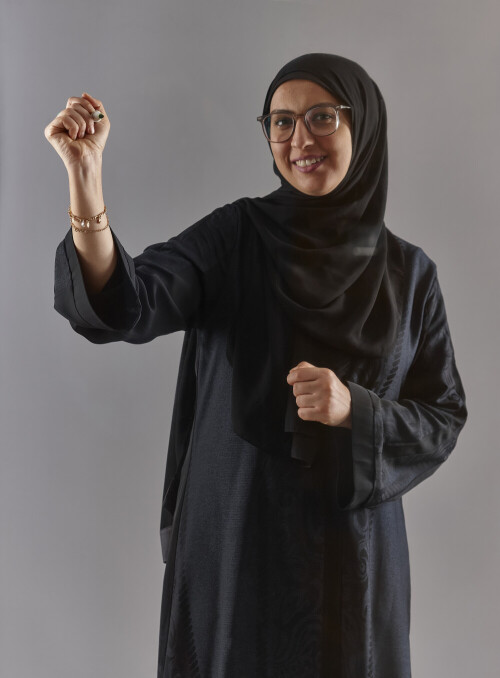 Woman in black abaya, hijab and glasses holding a marker pen to write on a transparent board with different reactions and expressions on grey background