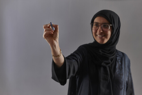 Woman In Abaya Writing On Transparent Board