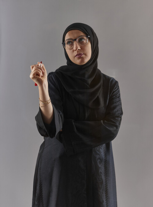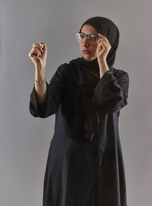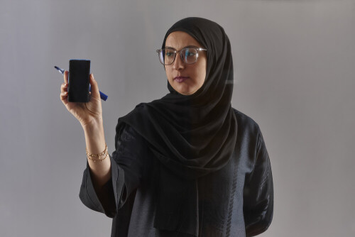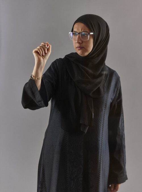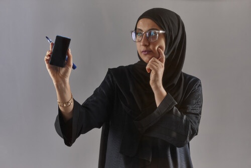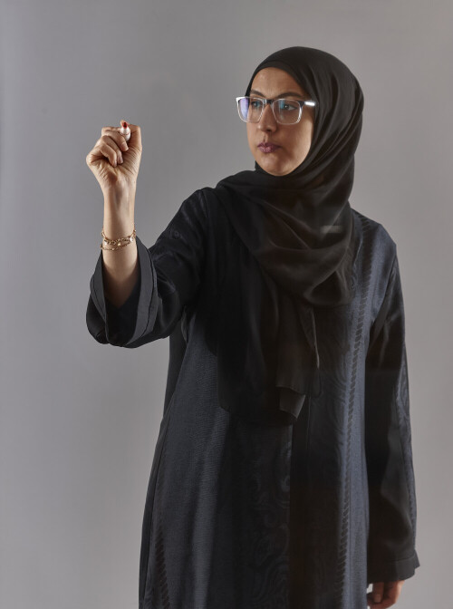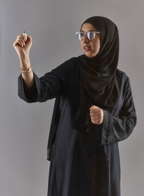 Woman in abaya writing on transparent board