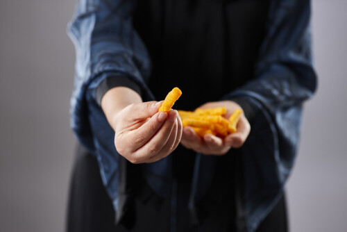 Woman in abaya holding different kinds of snacks in different positions