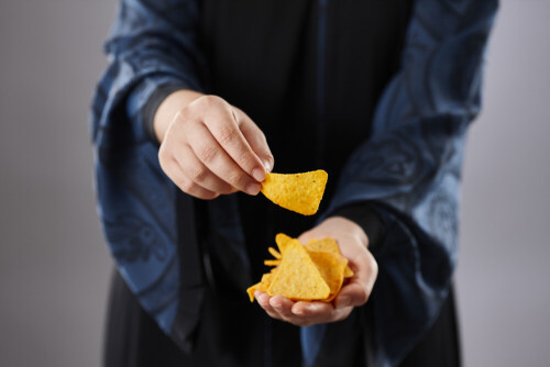 Woman in abaya holding different kinds of snacks in different positions