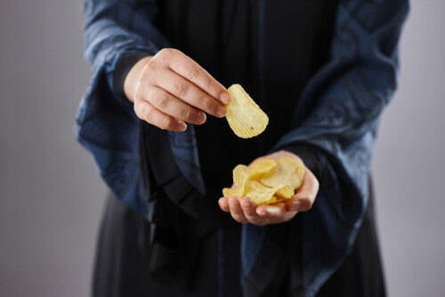 Woman in abaya holding different kinds of snacks in different positions