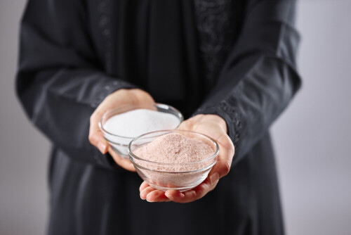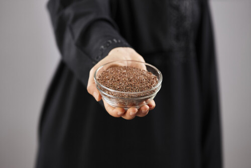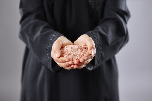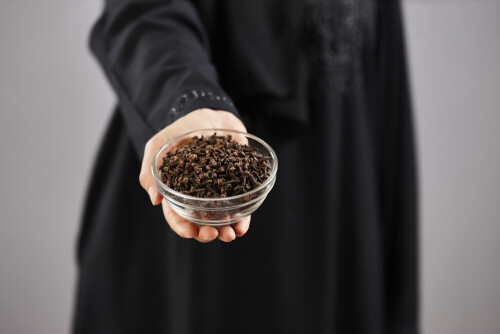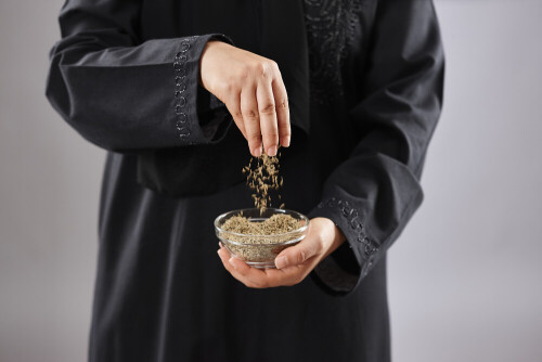 Woman in abaya holding different kinds of spices in different positions