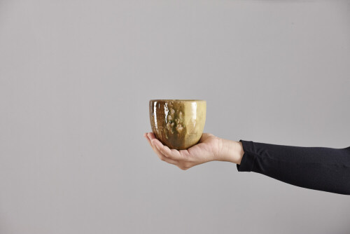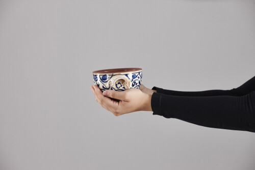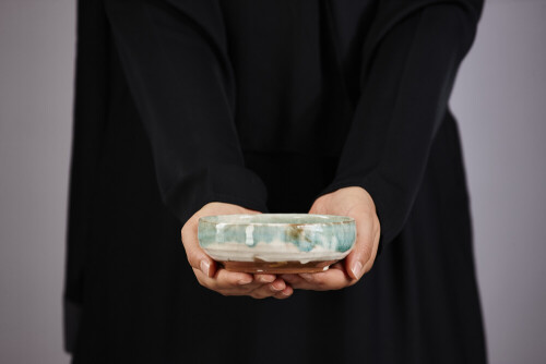 A woman in black abaya holding different pottery essentials in different positions
