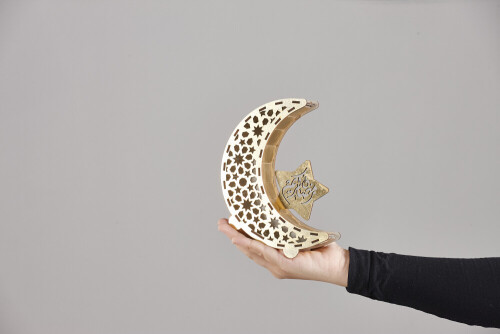 A woman in black abaya holding different ramadan lanterns in different positions